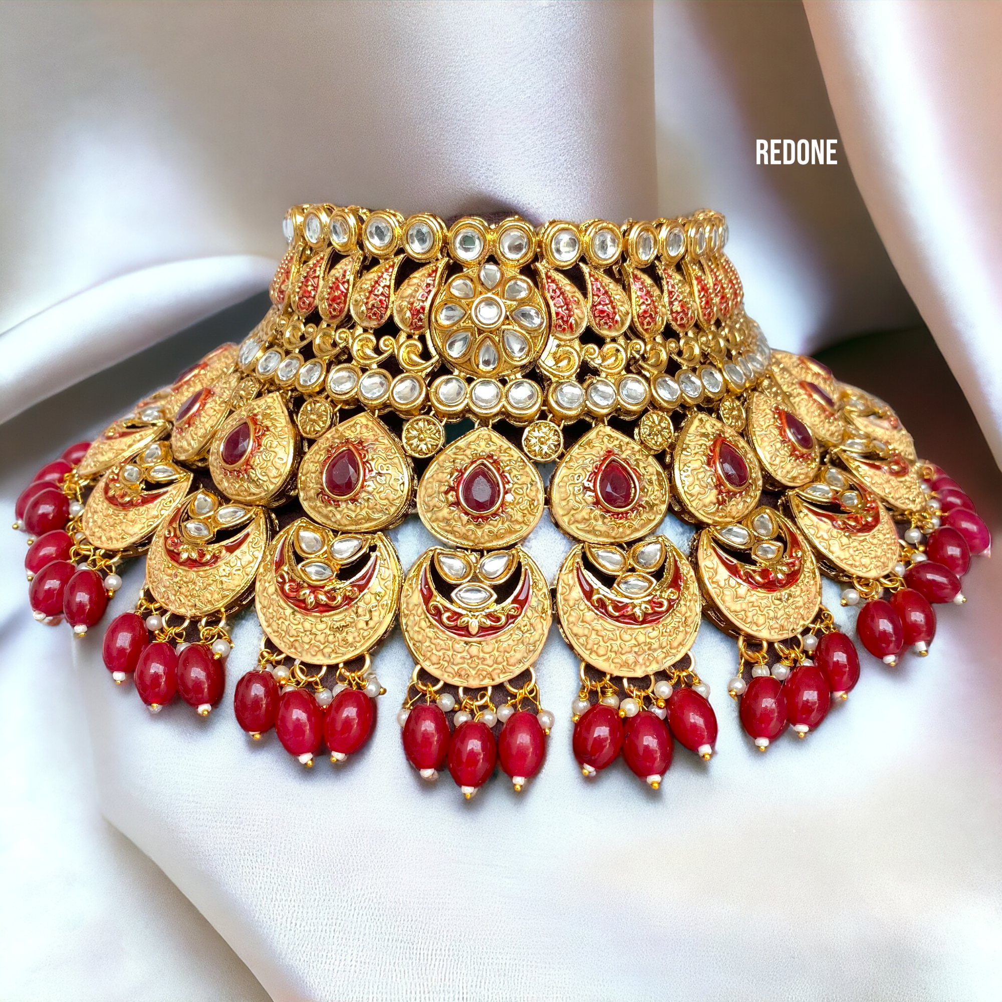 Enhance your bridal attire with this exquisite choker necklace and earring set, meticulously crafted for the modern bride. This set combines traditional elegance with contemporary style, making it the perfect accessory for your special day.