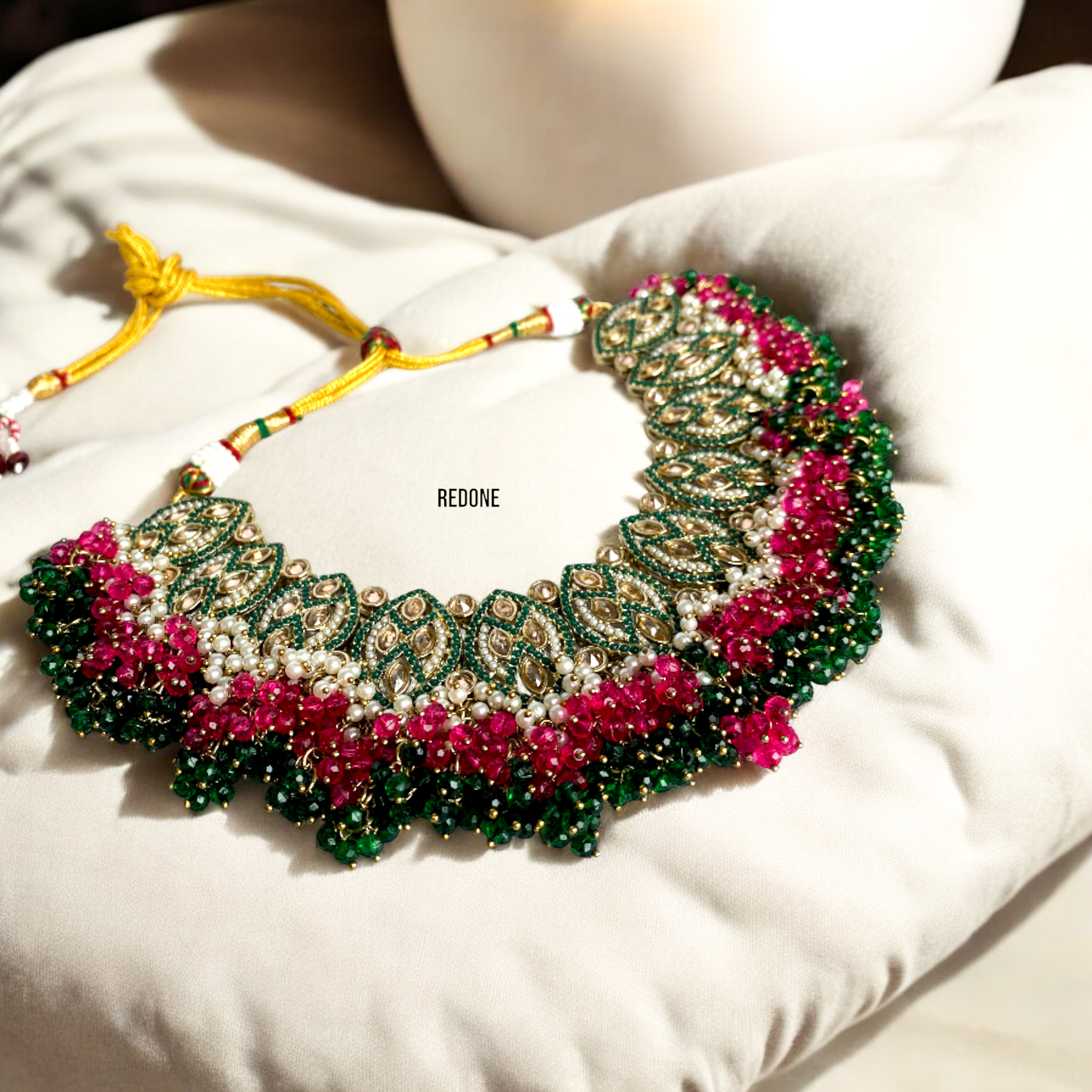 Elevate your bridal ensemble with this intricately designed choker necklace from Redone. This luxurious piece showcases a blend of deep rani pink, lush green, and radiant pearls, intricately woven into a lace-like pattern. The rich embellishments and delicate craftsmanship highlight the essence of traditional elegance, making it the perfect accessory for your special day. Secure it gracefully around your neck with the traditional golden thread for a touch of timeless beauty.